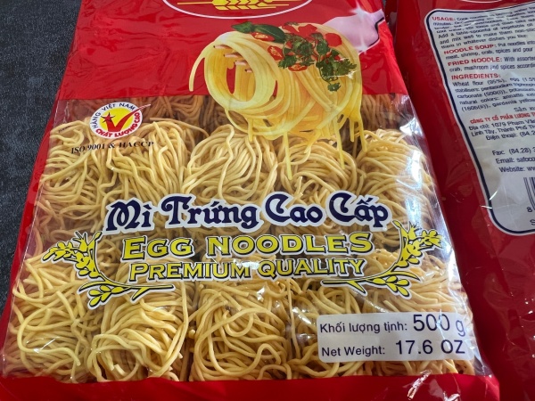 Thành phần: Bột mì (95%), trứng (,5%), muối i-ốt, chất ổn định (Pentasodium triphosphate (451i)), natri carbonat (500(i)), kali carbonat (501(i)), màu tự nhiên chất chiết xuất từ annatto norbixin - based (160b(ii)) , gardenia yellow (164).